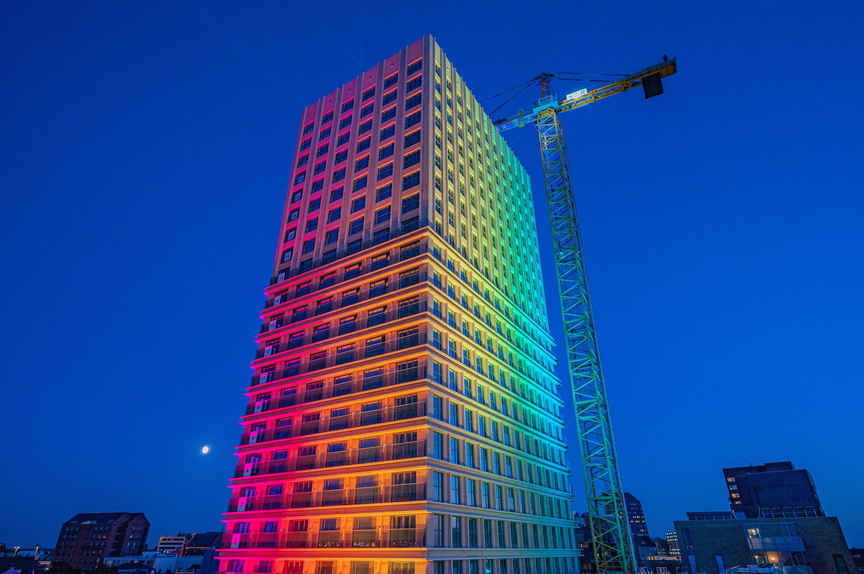 Met deze aanlichting wordt gevierd dat het gebouw het hoogste punt heeft bereikt: 76 meter. Een mijlpaal waar we met z’n allen hartstikke trots op zijn. Een kleine anderhalf jaar na de start van de bouw werd het hoogste punt net voor de bouwvak al aangetikt, maar dat kon toen niet gevierd worden in verband met de veiligheid rond het gebouw vanwege de Tilburgse kermis en de zomervakantie. Het traditionele pannenbier is in dit geval een meerdaags lichtevent, want tot en met zondag 9 oktober wordt met deze lichtshow de woontoren letterlijk en figuurlijk in de spotlights gezet.